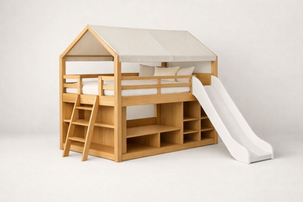 Letto a Castello per Bambini con Scivolo in Legno di Rovere e Tela Beige