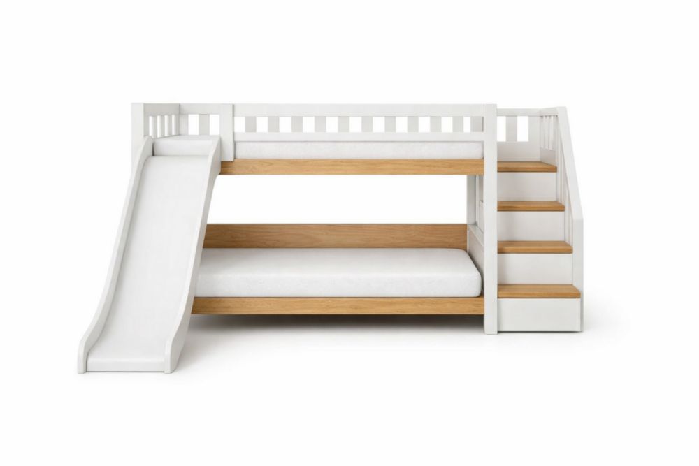 Letto a Castello per Bambini con Scivolo e Scala in Legno di rovere massello Bianco e Rovere