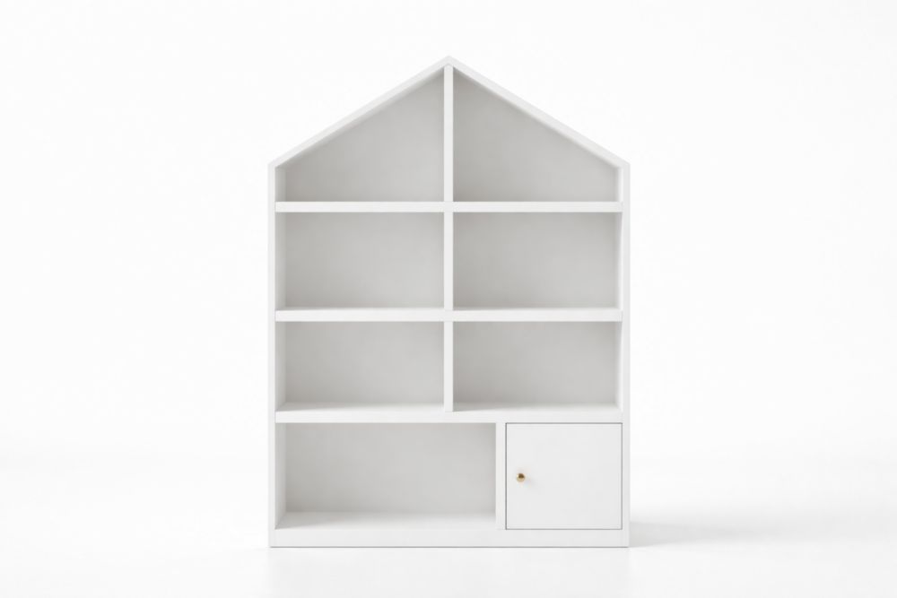 Libreria a Forma di Casa in MDF Bianco con Mensole e Anta