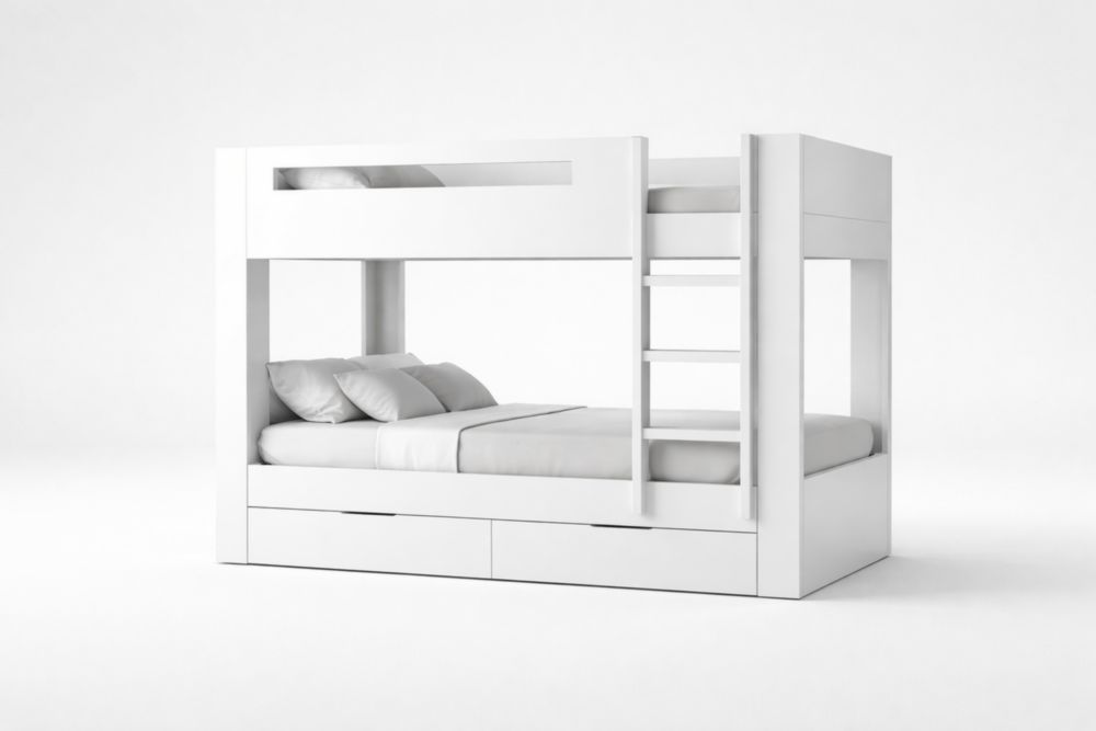 Descrizione della struttura: Letto a castello con scala frontale e due cassetti integrati nella base.