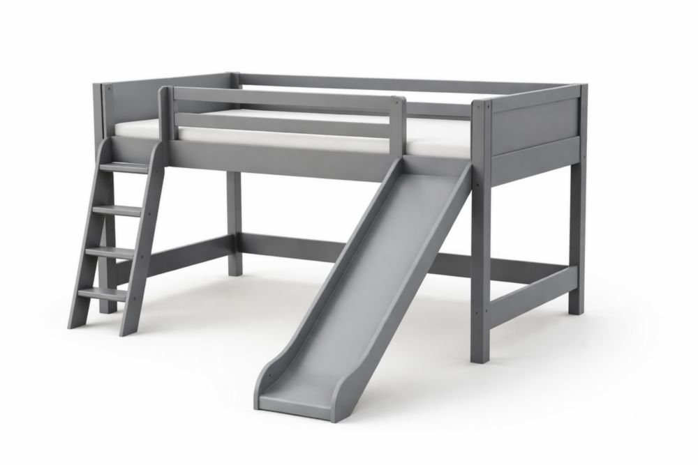 Letto a soppalco in legno massello massello con scivolo e scala integrati.